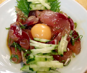さばとゴマ油、ネギを合わせ醤油で、しゅりの卵の卵黄のみで和える。