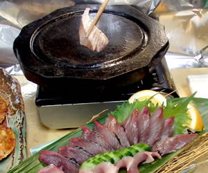 アツアツの阿蘇山の溶岩石でサッとあぶり、ポン酢だれ・塩で食べる。